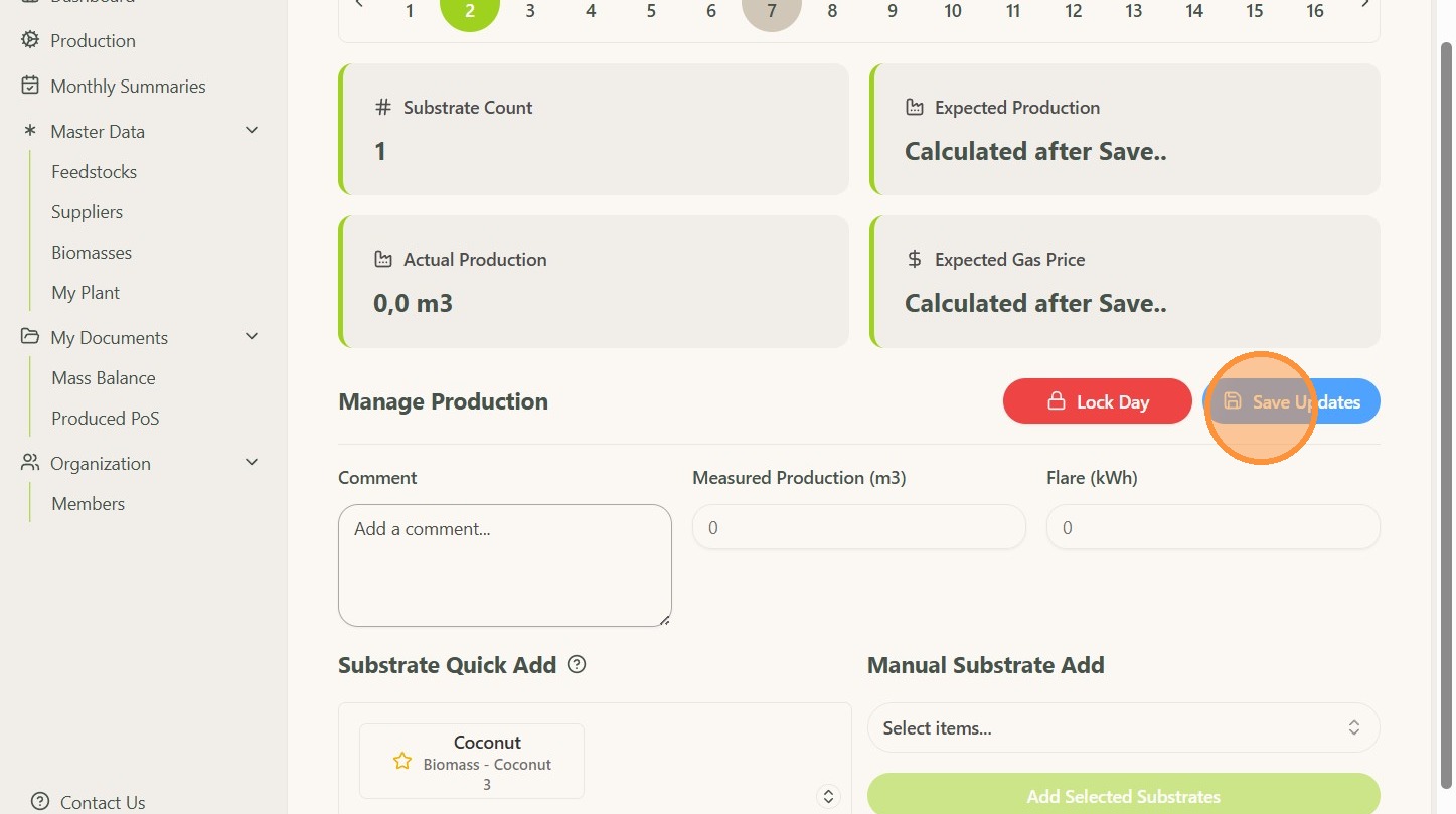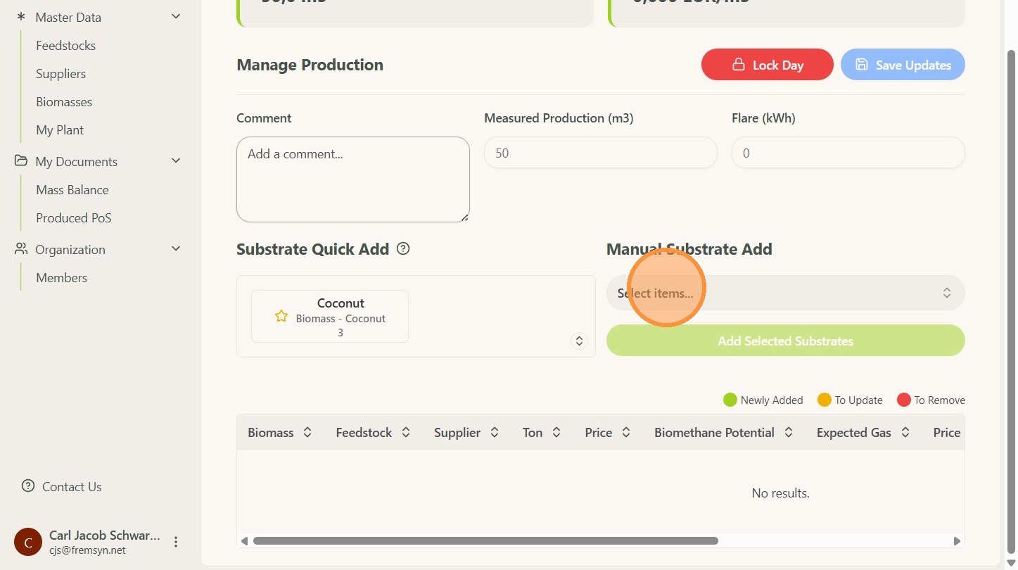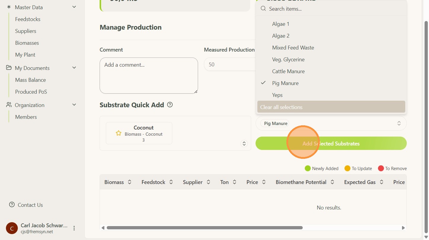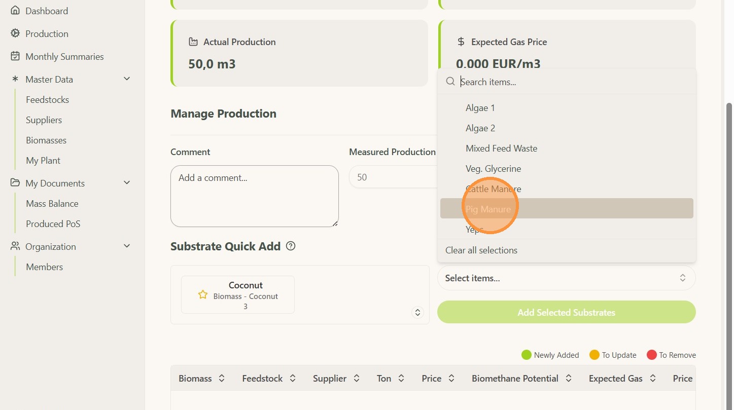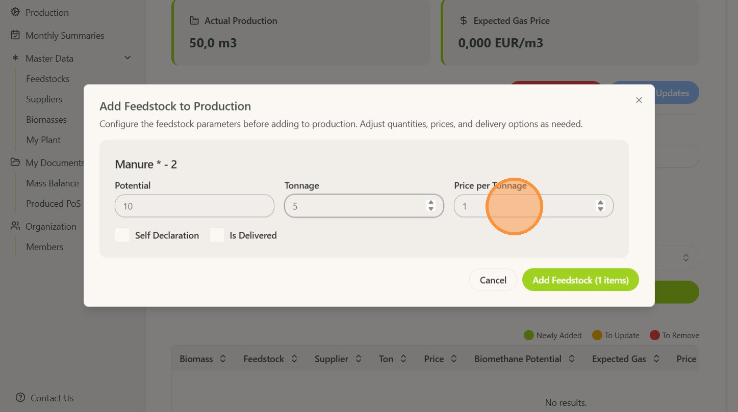 NOTE: Only feedstock that has been added in the feedstock list can be selected.